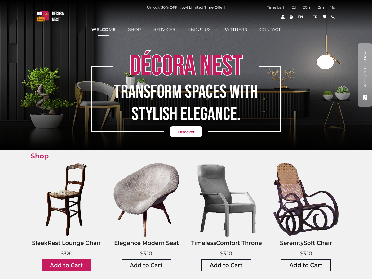 - Beautiful Banner Section: Highlight your best-selling items, services, or promotions with an elegant banner section. This attention-grabbing feature adds a professional touch to your home decor site