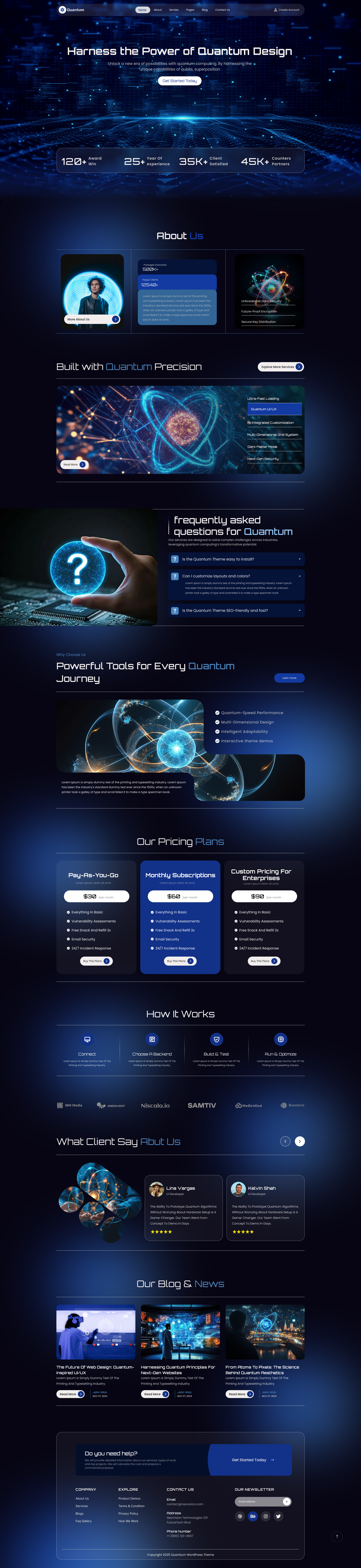 Quantum also supports WooCommerce, so you can easily add an online store to your blog or website, selling products or services directly to your audience. This makes it an ideal choice for entrepreneurs, freelancers, or bloggers looking to monetize their content. Performance, security, and accessibility are at the core of the Quantum WordPress Theme. Optimized for speed, it ensures fast-loading pages that improve both user experience and search engine rankings. SEO-friendly design elements make it easier for your website to rank higher on Google, helping you reach a larger audience organically. Quantum is also translation-ready and compatible with WPML, enabling you to create multilingual websites for a global reach. Social media integration allows seamless sharing, encouraging engagement across multiple platforms. Regular updates ensure the theme stays compatible with the latest WordPress versions, while dedicated support provides peace of mind for users at any skill level. With its perfect balance of aesthetics, functionality, and flexibility, Quantum WordPress Theme empowers you to build a website that stands out from the crowd.